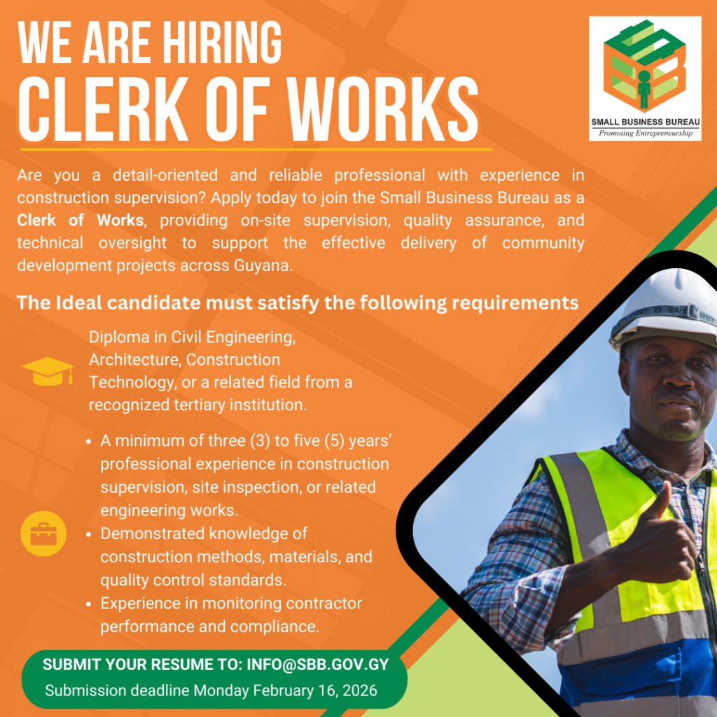 Applicants are required to submit their applications along with a detailed CV, to the e-mail address:  info@sbb.gov.gy