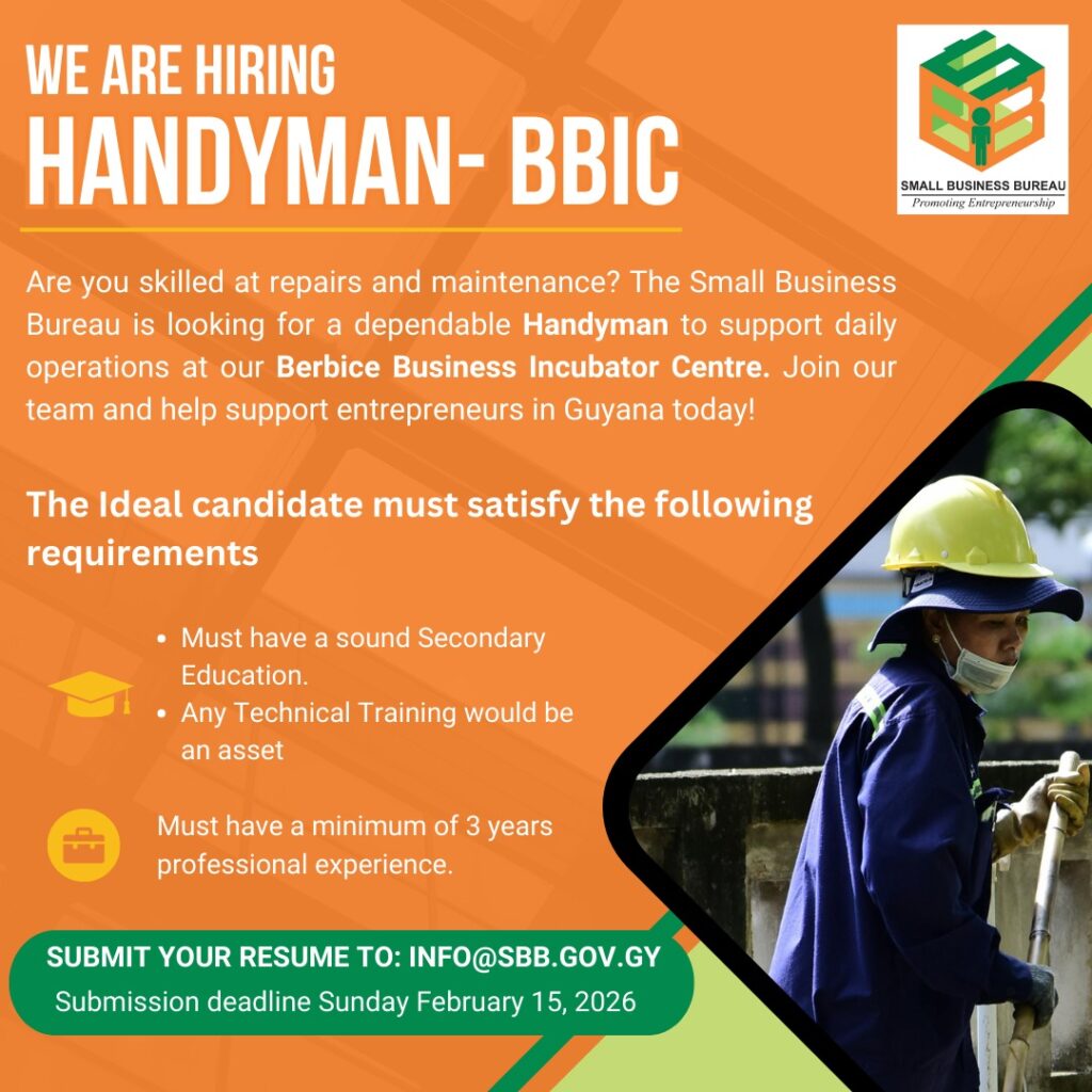 Applicants are required to submit their applications along with a detailed CV, to the e-mail address: info@sbb.gov.gy